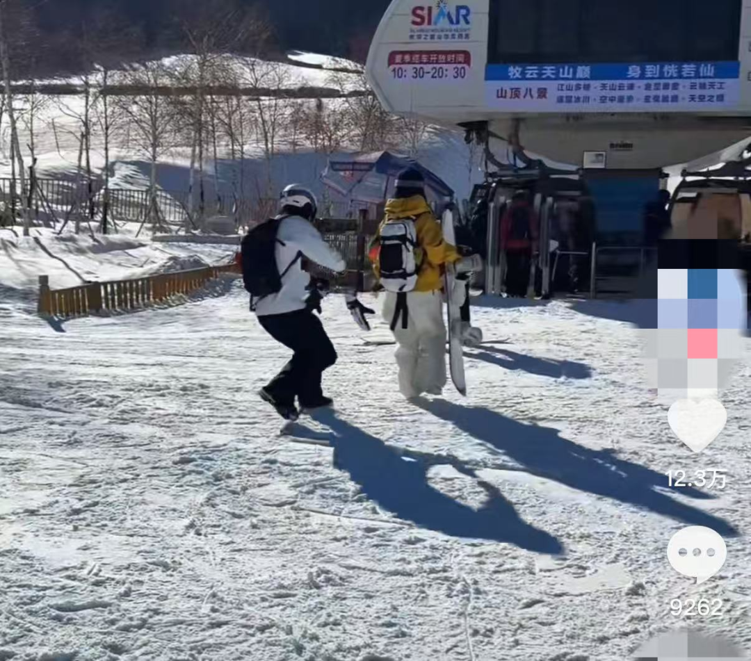 在此热度下,近日,一段在滑雪场剪吊牌的视频走红网络。视频中,身穿滑雪服的博主在经过多名身穿未摘吊牌的其他游客身旁时,偷偷剪掉其衣服上的吊牌并迅速跑开。