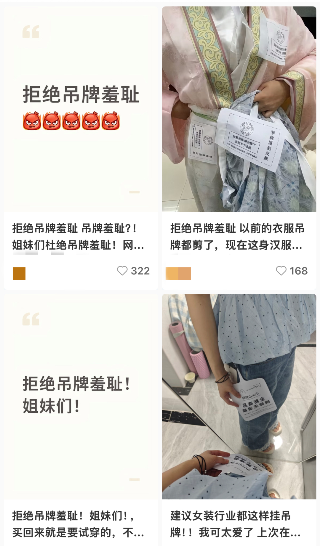 然而,社交平台上还有不少网友拍到消费者穿未拆吊牌的衣服外出,甚至还有网友发帖称,拒绝“吊牌羞耻”,呼吁大家穿带吊牌的衣服。